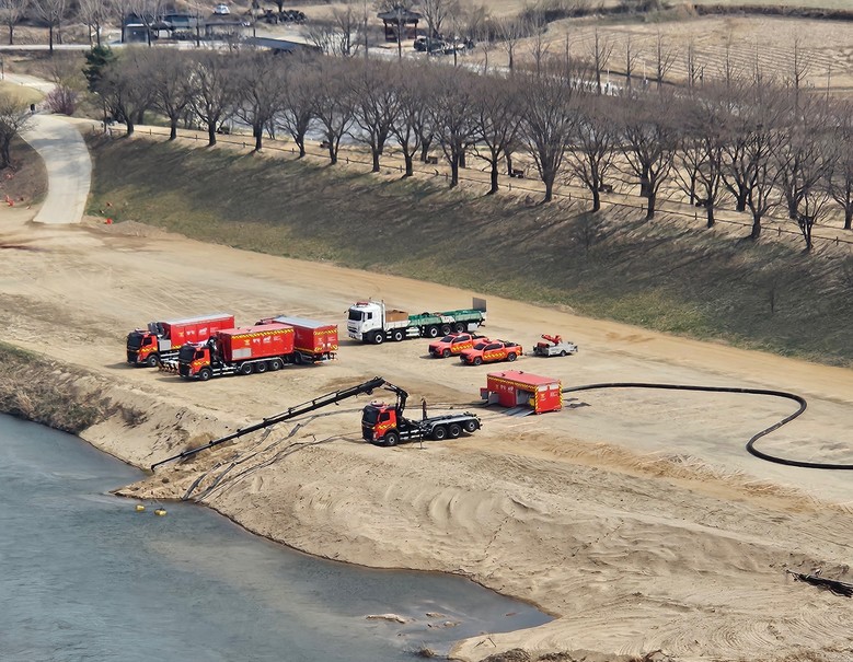 3월 28일 하회마을과 인접한 안동댐 하류 경북 안동시 풍천면 인근 낙동강 본류에서 산불 진압을 위한 소방 용수가 취수되고 있다.