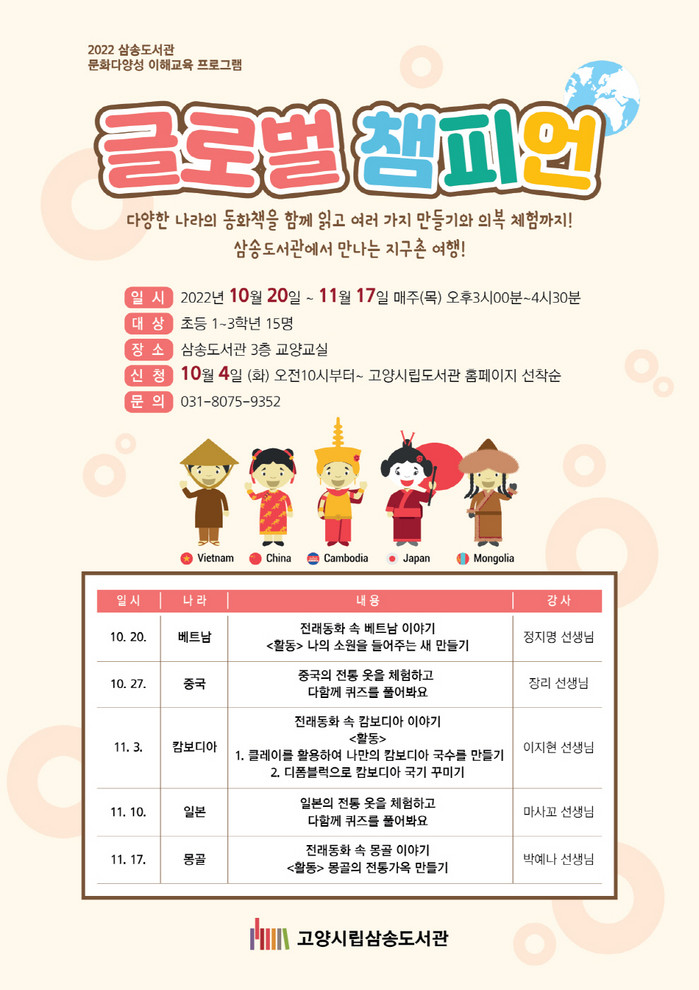 [부자동네타임즈 김인수기자] 고양특례시(시장 이동환) 삼송도서관에서 초등학교 1~3학년을 대상으로 10월 20일부터 11월 17일까지 문화 다양성 이해교육 프로그램 ‘글로벌 챔피언’을 운영한다.