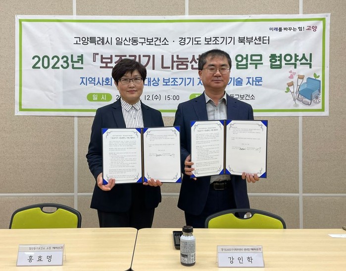 [부자동네타임즈 김인수기자] 고양특례시(시장 이동환) 일산동구보건소가 지난 12일 경기도보조기기북부센터와 지역사회 장애인 대상 보조기기 지원사업을 위한 ‘보조기기 나눔센터’ 업무협약을 체결했다.