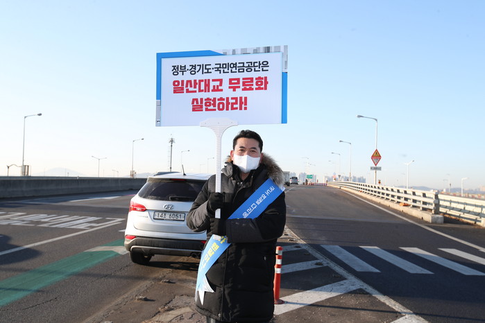 [부자동네타임즈 김인수기자] 고양시의회(의장 이길용) 양훈 의원이 2월 9일 일산대교 요금소 앞에서 통행료 무료화 촉구를 요구하는 1인 시위를 시작했다.