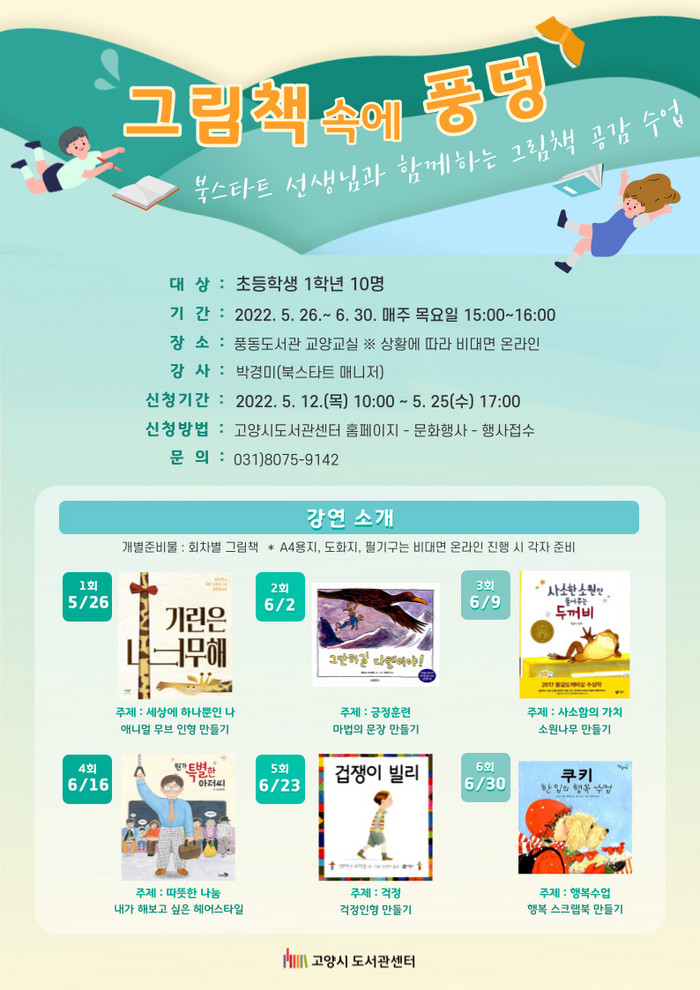 참가 신청은 5월 12일(목) 오전 10시부터 고양시도서관센터 홈페이지를 통해서 할 수 있으며 선착순 10명을 모집한다. 회차별 주제 관련 그림책은 미리 읽고 와야 원활한 독후활동이 가능하다.