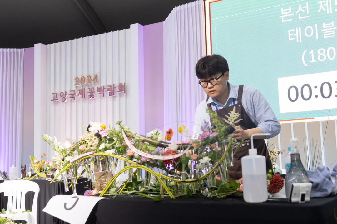 2024고양국제꽃박람회 실내전시관인 화훼산업관에서 개최된 이번 대회는 전국에서 총 19인이 참가했으며, 2일간 예선 2개 작품과 본선 3개 작품을 행사장에서 직접 제작해 경연을 펼쳤다.