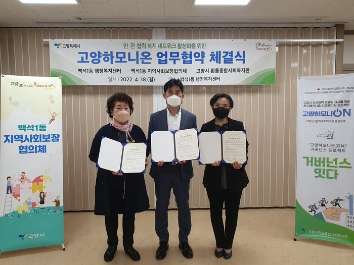 [부자동네타임즈 김인수기자] 고양시 백석1동 행정복지센터(동장 이재복)와 백석1동 지역사회보장협의체(민간위원장 임흥순)는 지난 18일 고양시 흰돌종합사회복지관과 ‘고양하모니ON’업무협약을 체결했다.