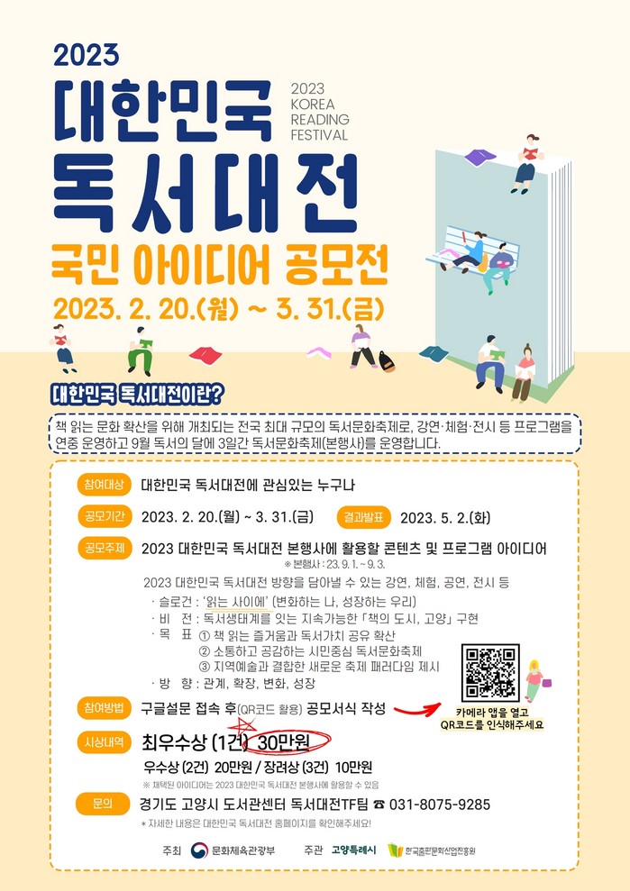 [부자동네타임즈 김인수기자] 고양특례시(시장 이동환)가 ‘2023 대한민국 독서대전 아이디어 공모전’을 개최한다. 이번 공모전은 시민들이 오는 9월 열리는 독서대전의 콘텐츠 및 프로그램을 직접 제안할 수 있는 기회가 될 예정이다.