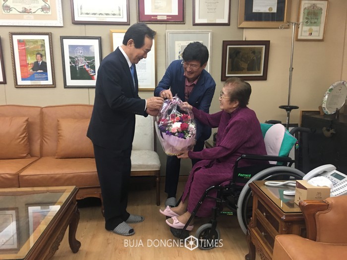 이에 이희호 여사는 정 의장에게 "나라를 빛나게 해줘서 감사하다"고 격려한 뒤, 꽃을 선물로 전달했다.