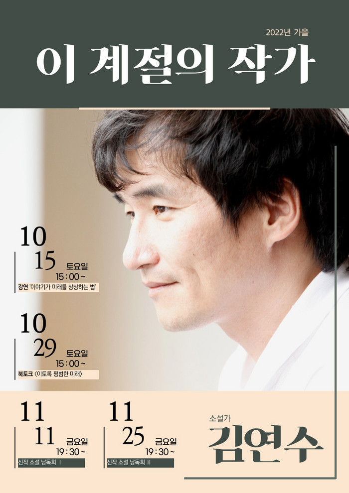 10월에는 토요일 2차례 김연수 작가를 만나볼 수 있다. ▲ 10월 15일 3시에는 강연 ‘이야기가 미래를 상상하는 법’ ▲ 10월 29일 3시에는 문학동네 편집자 김내리가 사회를 맡아 신작 <이토록 평범한 미래> 북토크를 진행한다. ▲ 11월에는 11일, 25일 금요일 저녁 7시 반 두 차례 신작 소설 낭독회를 가질 예정이다.