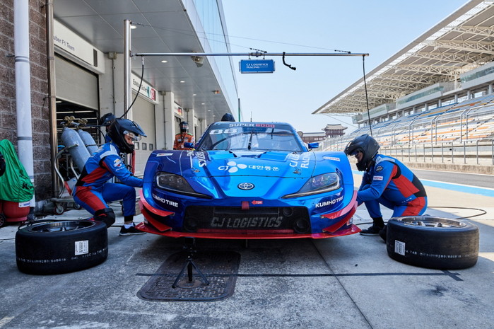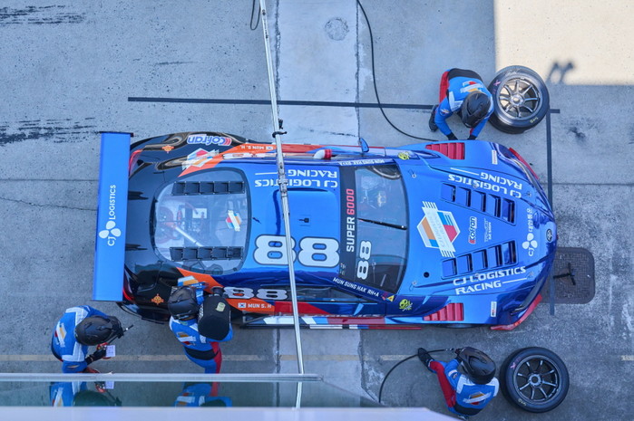 [사진설명] 피트스톱하며 급유와 타이어를 교체하고 있는 CJ로지스틱스 레이싱팀.
