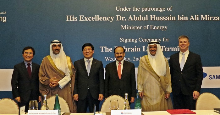 | △ 2일 바레인 현지 포시즌 호텔에서 열린 바레인 해상 LNG 수입 터미널 프로젝트 EPC 계약식에서 시카 모하메드 알 칼리파 바레인 국영가스청 CEO(왼쪽 두번째)와, 허선행 GS건설 플랜트부문 대표(왼쪽 세번째), 압둘 후세인 빈 알리 미르자 바레인 에너지부 장관(왼쪽 네번째) 등을 비롯한 프로젝트 관계자들이 기념 촬영하고 있다. <사진제공=GS건설> |