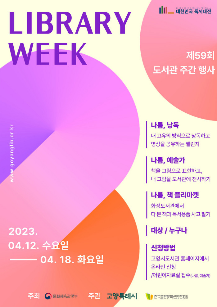 [부자동네타임즈 김인수기자] 2023 대한민국 독서대전을 유치해 다양한 책의 도시 연중 프로그램을 펼치고 있다. 고양시 도서관센터는 오는 4월 12일 ‘도서관의 날’을 시작으로 18일까지 도서관주간 행사를 개최한다.