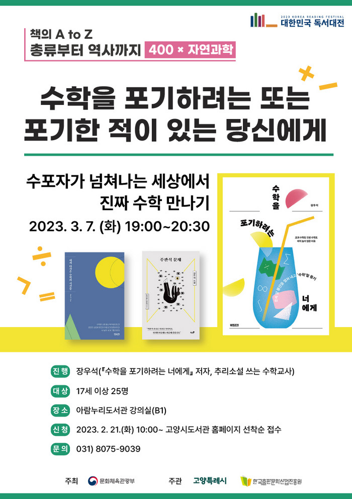 [부자동네타임즈 김인수기자] 고양특례시(시장 이동환) 아람누리도서관이 오는 3월 7일 저녁, 수학을 포기하려는 너에게의 저자 장우석 작가와의 만남을 운영한다.