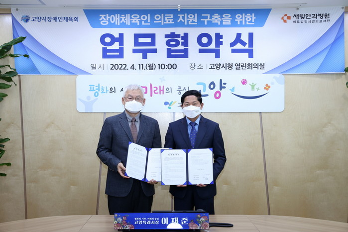 [부자동네타임즈 김인수기자] 고양시장애인체육회는 4월 11일 세경의료재단 새빛안과병원과 손을 잡고 장애인 선수에게 체계적인 의료서비스를 제공하는 것에 상호 협력하기로 했다고 밝혔다.