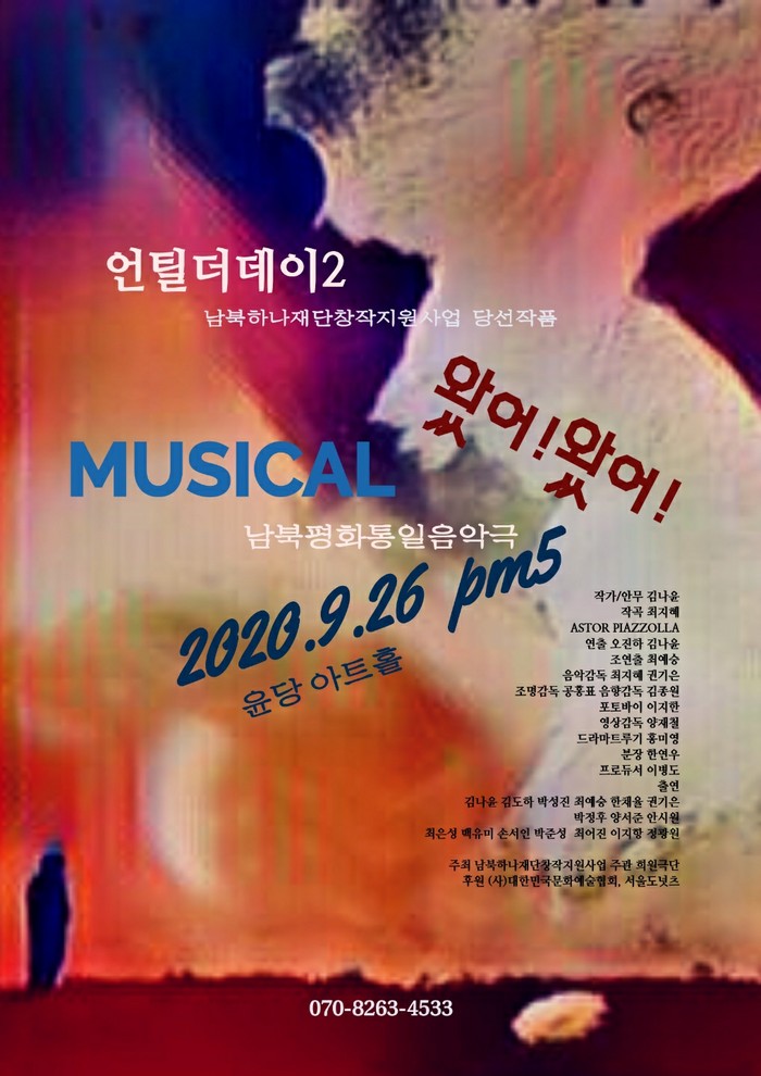 [부자동네타임즈 김인수기자] 뮤지컬 ‘언틸더데이' 의 제작팀인 희원극단이 올해 또 하나의 통일뮤지컬인  '왔어 왔어' 를 제작, 발표한다. ‘언틸더데이' 는 2011년 개막공연 이후 8년간 무대에 올려졌으며 북한지하교인들의 실화라는 다소 무거운 주제를 다루었지만 입소문을 타고 전해져 3만명 이상이라는 최다관객을 동원한 뮤지컬이다.