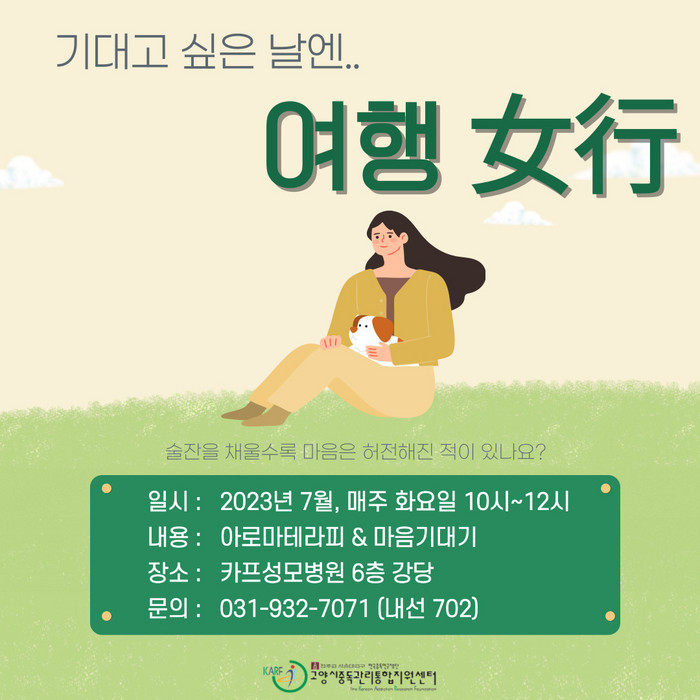 [부자동네타임즈 김인수기자] 고양시중독관리통합지원센터가 여성 음주자 치유 프로그램 ‘기대고 싶은 날엔, 여행(女行)’을 운영한다.