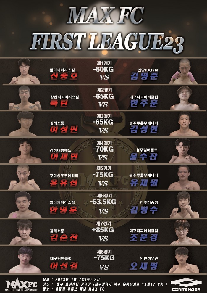 [부자동네타임즈 김인수기자] 국내 최대 입식격투기 단체 MAX FC(대회장 류제석)가 내년 1월 7일(토) 대구 한국패션센터 공연장에서 열리는 ‘MAX FC 컨텐더리그 21’의 오프닝 격인 ‘퍼스트리그 23’의 출전 선수를 확정 발표했다.