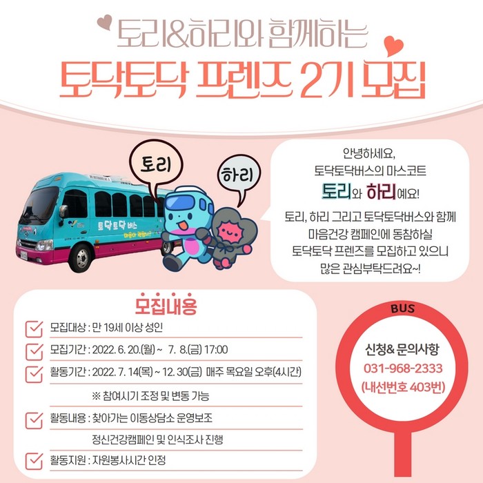 [부자동네타임즈 김인수기자] 고양시정신건강복지센터(센터장 이정석)는 6월 20일부터 7월 8일까지 찾아가는 이동상담소 토닥토닥 버스 운영을 위한 토닥토닥 프렌즈를 모집한다고 밝혔다.
