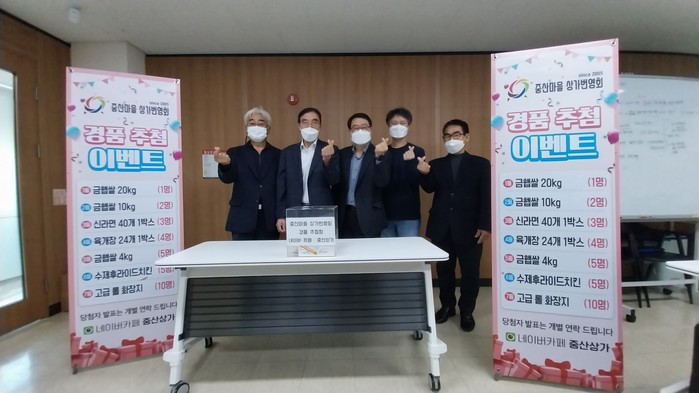 중산마을 상가번영회에서는 지역경제 활성화를 위해 지난 10월 15일 진행된 중산1동 마을축제에 중산마을 상가번영회 부스를 마련하고, 회원들이 기증한 쌀, 라면, 화장지 등 70만원 상당의 경품에 대하여 응모 행사를 실시했고, 이번 추첨 행사를 통해 응모자 중 30명을 추첨하였다. 행운의 경품 당첨자에게는 상가번영회에서 응모권에 기재된 연락처로 문자를 통해 개별 안내할 예정이다.