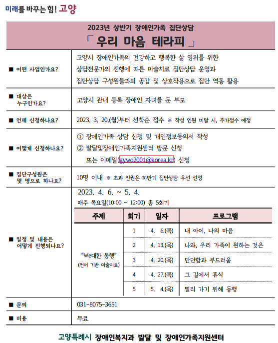 장애인 가족상담은 집단상담과 개인상담으로 나뉜다. 집단상담 ‘우리마음 테라피’는 4월 6일부터 5월 4일까지 매주 목요일 장애인 자녀를 둔 부모를 대상으로 언어기반 미술치료 방식으로 진행된다.