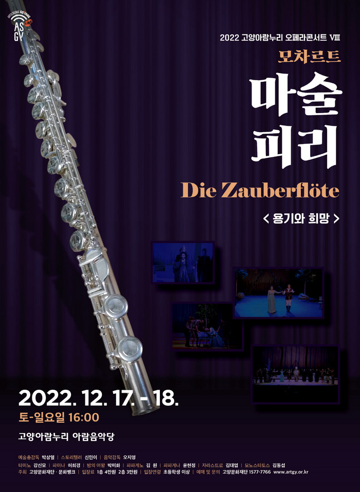 [부자동네타임즈 김인수기자] 고양문화재단(대표이사 정재왈)은 2022 아람누리 오페라 콘서트 시리즈의 마지막 무대로 모차르트 최후의 걸작, 모험과 신비의 오페라 <마술피리>를 오는 12월 17일(토)와 18일, 양일간 고양아람누리 아람음악당에서 선보인다.