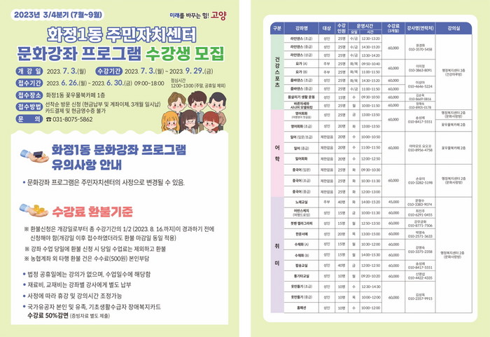 수강신청은 6월 26일부터 6월 30일까지(평일 9시 ~ 18시, 12시 ~ 13시 점심시간 제외) 화정1동 행정복지센터 옆 꽃우물 북카페에서 선착순으로 진행된다.
