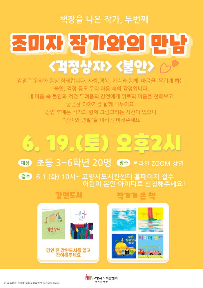 [부자동네타임즈 김인수기자] 고양시 덕이도서관에서는 오는 6월 19일 북토크 프로그램‘조미자 작가와의 만남’을 운영한다.