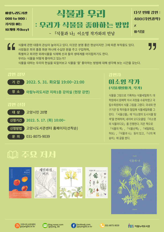‘식물과 우리’는 000 to 900의 다섯 번째 강연으로, 한국십진분류표상 400번대 ‘자연과학’ 분야에 해당한다. 이번 강연은 식물세밀화가이자 식물과 나의 저자인 이소영 작가가 맡아 진행한다.