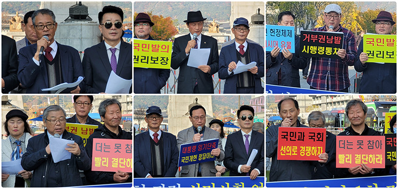 11.12(화) 광화문광장 이순신장군 동상 앞에서 33개 시민단체가 개최한 ‘개헌안 등 국민발의 관련 시민사회 연속제안 1차 기자회견’ 주요참석자들(제공 : 약자와의 동행TV, 좌측 위 사진에서부터 1) 송운학, 김선홍, 2) 김장석, 이근철 ‘국민연대’ 상임대표, 송운학, 3) 문민현 ‘헌법개정국민회의’ 사무총장, 명노석 ‘금빛수다’ 대표 겸 ‘강북민회’ 감사, 김장석, 4) ‘우리헌법읽기국민운동’ 이미영 이사, 이주영 이사장, 김용희 ‘성남시 노동법률 무료상담소’ 소장(뒷줄) 외, 5) 송운학, 류종열, 김선홍, 6) 윤영대 ‘투기자본감시센터’ 공동대표, 허영구 ‘직접민주서울 자치당’ 공동위원장