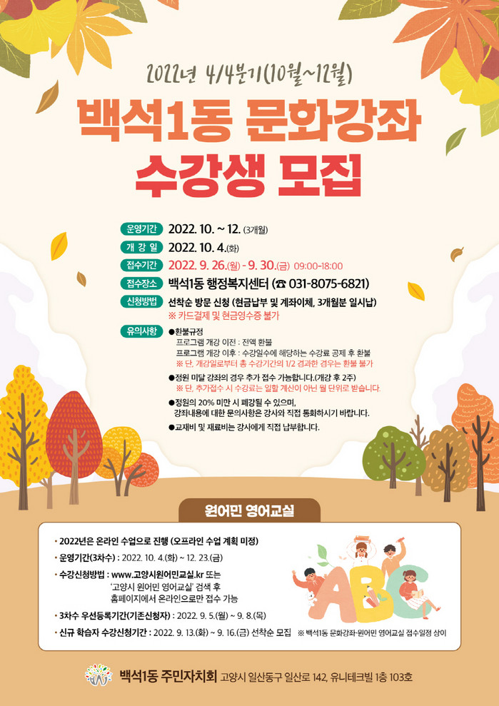 [부자동네타임즈 김인수기자] 고양특례시 일산동구 백석1동 주민자치회(회장 이석구)는 9월 26일부터 9월 30일까지 4분기(10월~12월) 문화강좌 수강희망자를 모집한다고 밝혔다.