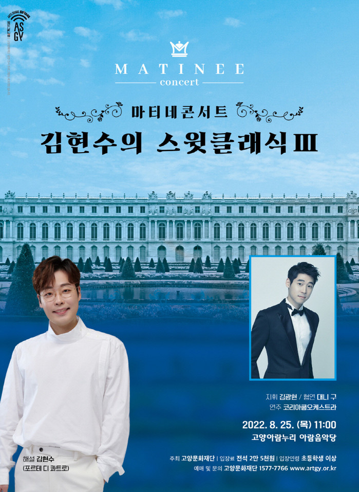 [부자동네타임즈 김인수기자] 고양문화재단(대표이사 정재왈)은 2022년 세 번째 아람누리 마티네 콘서트 <김현수의 스윗클래식 Ⅲ>을 오는 8월 25일(목) 오전 11시, 고양아람누리 아람음악당에서 선보인다. 평일 오전의 대표 클래식 프로그램인 <아람누리 마티네 콘서트>는 저렴한 입장료에 즐길 수 있는 수준 높은 클래식 입문 공연으로 매년 많은 사랑을 받고 있는 고양아람누리 대표 기획공연 시리즈이다.