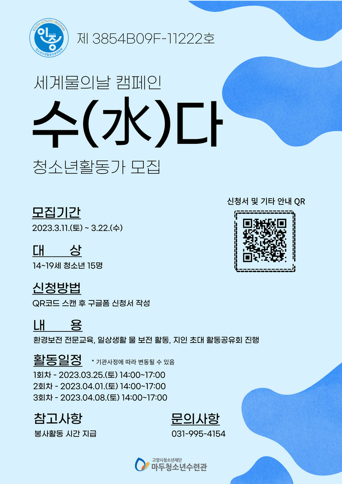 [부자동네타임즈 김인수기자] 고양시청소년재단 마두청소년수련관에서는 물의 소중함을 인식하고, 청소년의 환경에 대한 자주 의식을 높일 수 있는 세계 물의 날 캠페인 ‘수(水)다’에 참여할 청소년활동가 15명을 3월 22일(수)까지 모집한다.