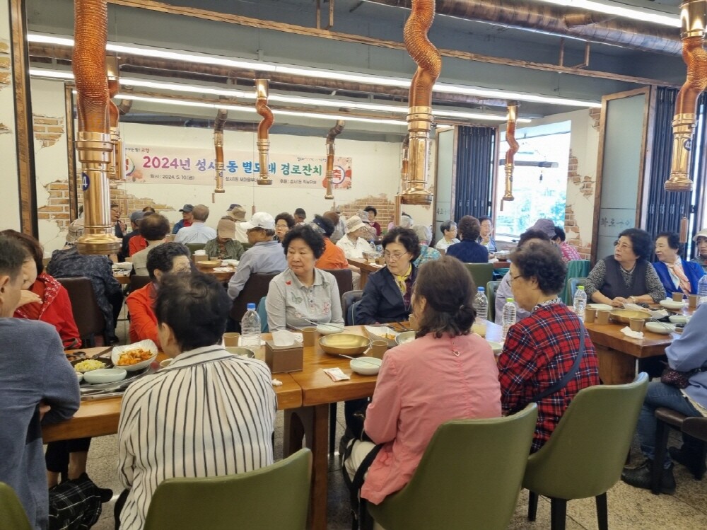 경로잔치는 새마을부녀회가 주관했으며 성사1동 직능단체 회원들과 유관단체 30여 명의 자원봉사자들의 후원이 이어졌다. 행사는 어르신에 대한 공경의식과 사회적 관심을 고취하고 지역사회의 효행을 도모하고자 실시됐다.