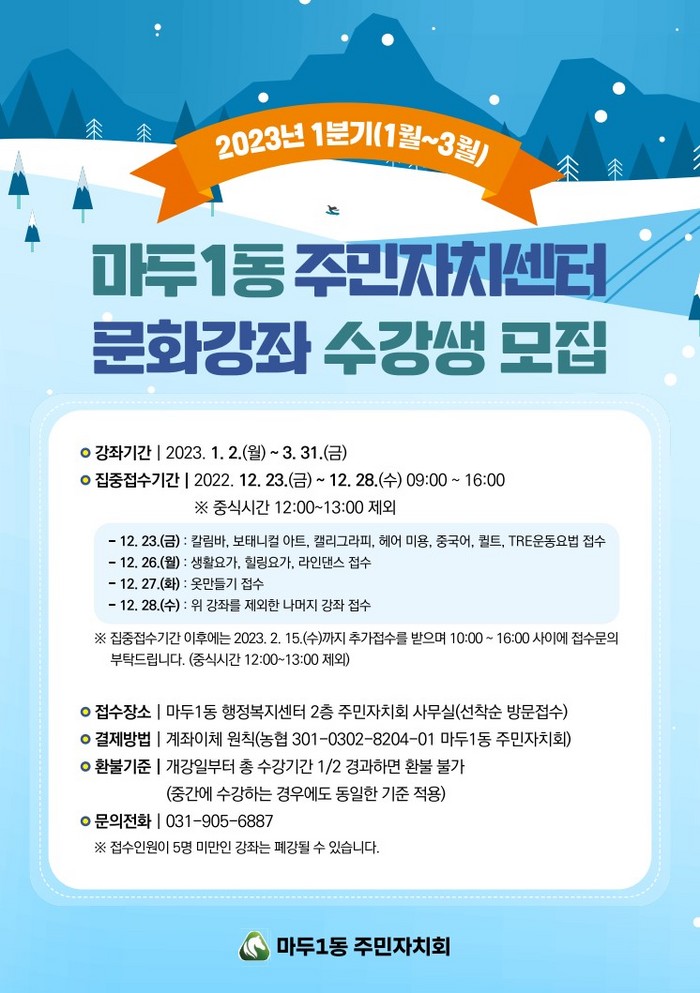 [부자동네타임즈 김인수기자] 고양특례시 일산동구 마두1동 주민자치회(회장 이바다)가 12월 23일부터 2023년 1분기 주민자치센터 문화강좌 프로그램 수강생을 모집 중이다.