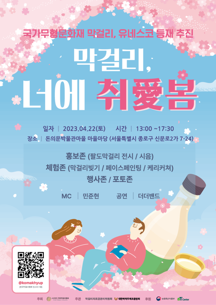 [부자동네타임즈 김인수기자] 막걸리 자조금 관리위원회 (사단법인 한국막걸리협회 / 대한탁약주제조중앙회)가 오는 4월 22일 돈의문박물관마을 일원에서 '막걸리, 너에 취愛봄' 이라는 주제로 막걸리 행사를 개최한다.