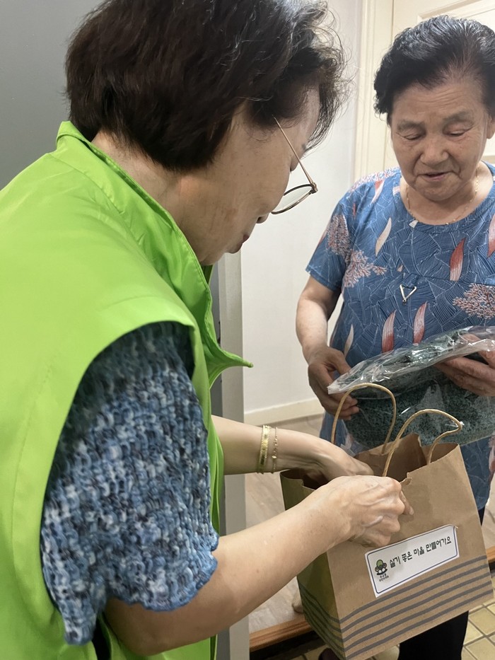주민자치회 위원들은 취약 계층 가구를 직접 방문해 안부 인사와 함께 가방과 수세미를 나눠 드렸고, 받으신 분들은 잘 사용하겠다며 고마움과 반가운 마음을 표시했다.
