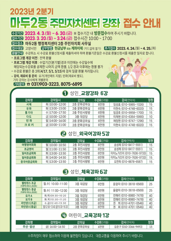 고양시 마두2동 주민자치센터, 2분기 문화강좌 수강생 모집.