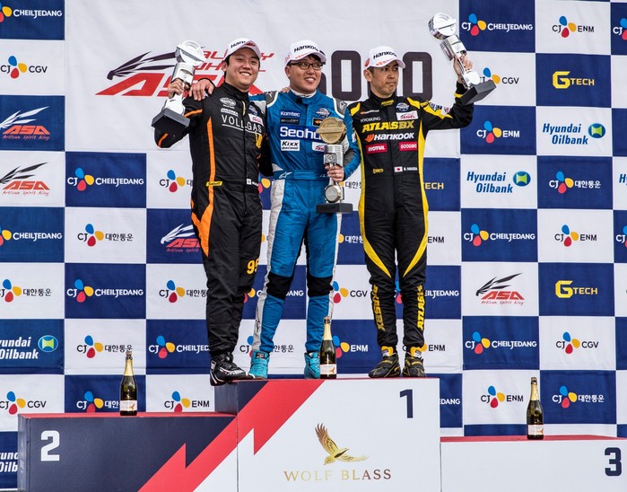 [사진설명] 지난해 에버랜드 스피드웨이에서 열린 CJ대한통운 슈퍼레이스 챔피언십 개막전 슈퍼 6000 클래스에서 포디움에 오른 김재현, 김중군, 야나기다 마사타카 (왼쪽부터)