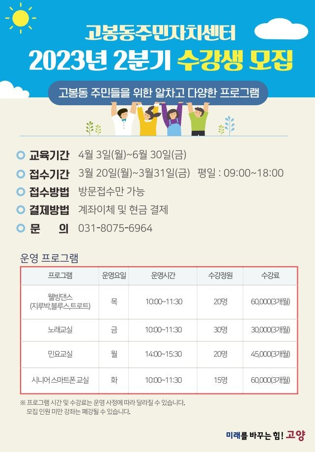 [부자동네타임즈 김인수기자] 고양특례시 고봉동 주민자치회가 오는 31일까지 2023년 2분기(4월 ~ 6월) 주민자치센터 문화강좌 수강생을 모집한다고 밝혔다.