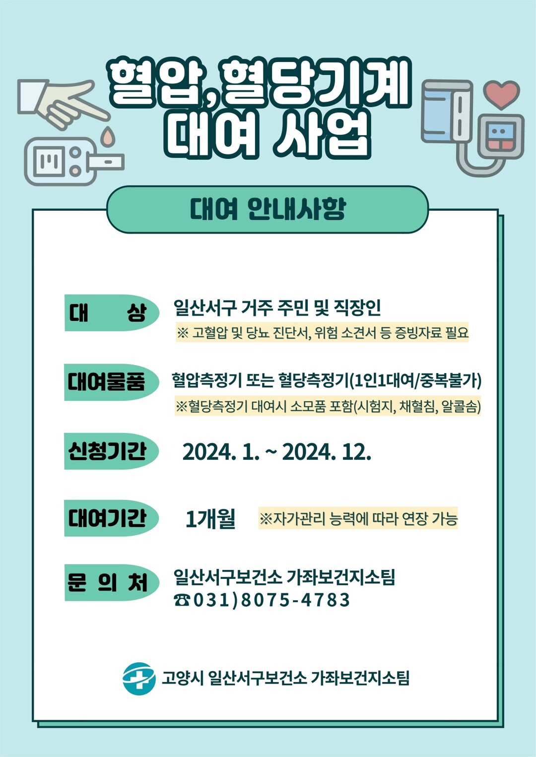 혈압‧혈당기 대여 사업은 일산서구 소재 지역주민 및 직장인들의 건강 관리를 위해 평소 혈압과 혈당을 체크하고 싶지만 장비를 준비하기 어려운 대상자들을 위한 사업이다.