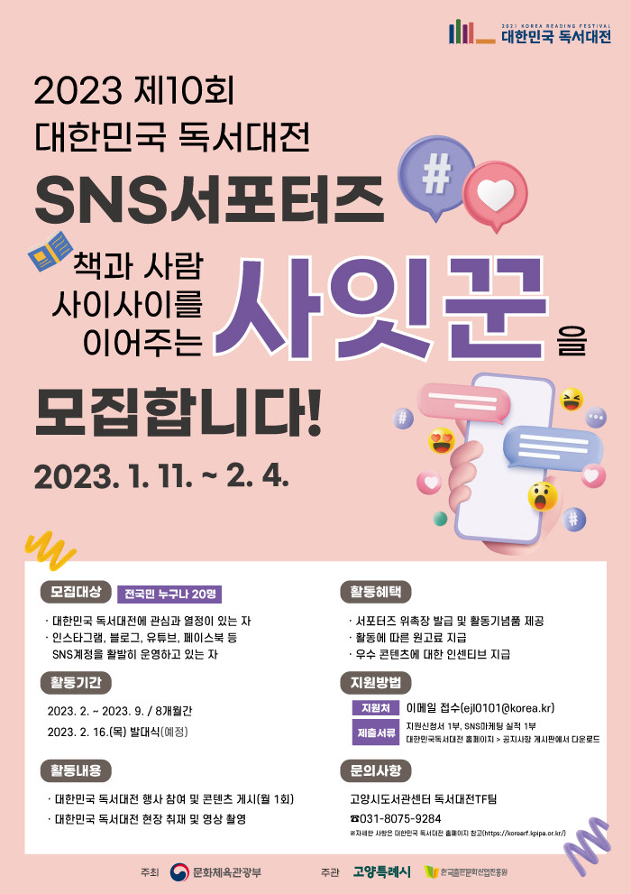 [부자동네타임즈 김인수기자] 고양특례시(시장 이동환)은 2023 대한민국독서대전 개최지로 선정됨에 따라 SNS 서포터즈 ‘사잇꾼’을 1월 11일부터 2월 4일까지 공개 모집한다.