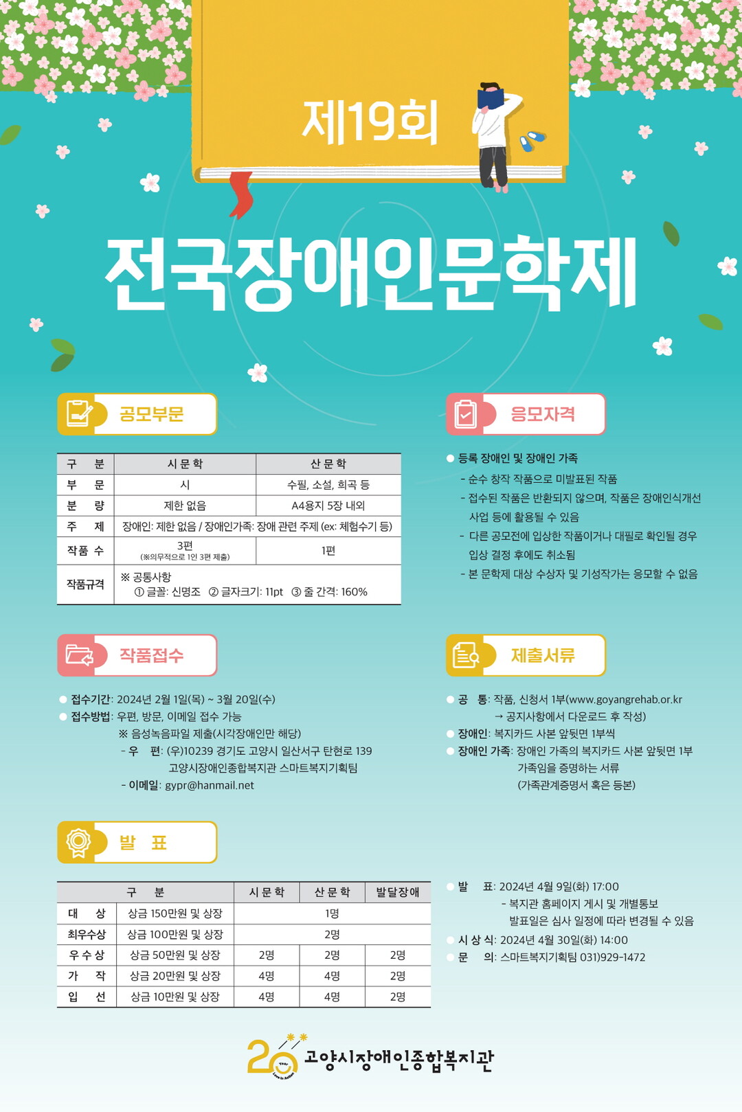 제19회 전국장애인문학제에 대한 자세한 내용은 고양시장애인종합복지관 누리집을 참고하거나 고양시장애인종합복지관 스마트복지기획팀(031-929-1472), 고양시 장애인복지과 장애인시설팀(031-8075-3296)으로 문의하면 된다.