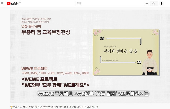 [부자동네타임즈 김인수기자] 고양시청소년재단(대표이사 박윤희) 일산서구청소년수련관은 지난 11월 23일 소속 청소년 프로젝트팀인 ‘WEWE 프로젝트’팀이 여성가족부에서 주최하는 2021 일본군 ‘위안부’ 관련 청소년 작품 공모전 심사 결과, 영상 부문 2위를 차지하여 부총리 겸 교육부장관상을 수상했다고 밝혔다.