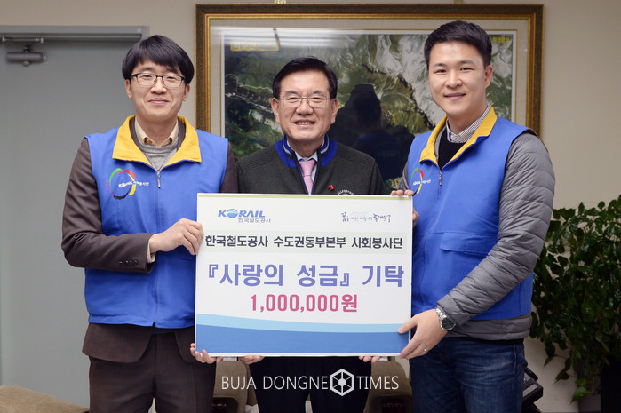 [부자동네타임즈 이병도 기자]동대문구(구청장 유덕열)는 22일 오후 3시 30분 한국철도공사 수도권동부본부 봉사단이 동대문구청을 방문해 구청장실에서 관내 노숙인을 위해 써달라며 성금 백만원을 기탁했다고 밝혔다.
