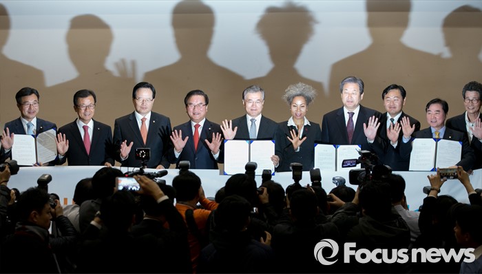 왼쪽부터 윤호중, 원혜영 새정치민주연합 의원, 정의화 국회의장, 정갑윤 국회 부의장, 문재인 새정치민주연합 대표, 가수 인순이, 김무성 새누리당 대표, 김관영 새정치민주연합 의원, 이석현 국회 부의장, 이목희 새정치민주연합 의원.