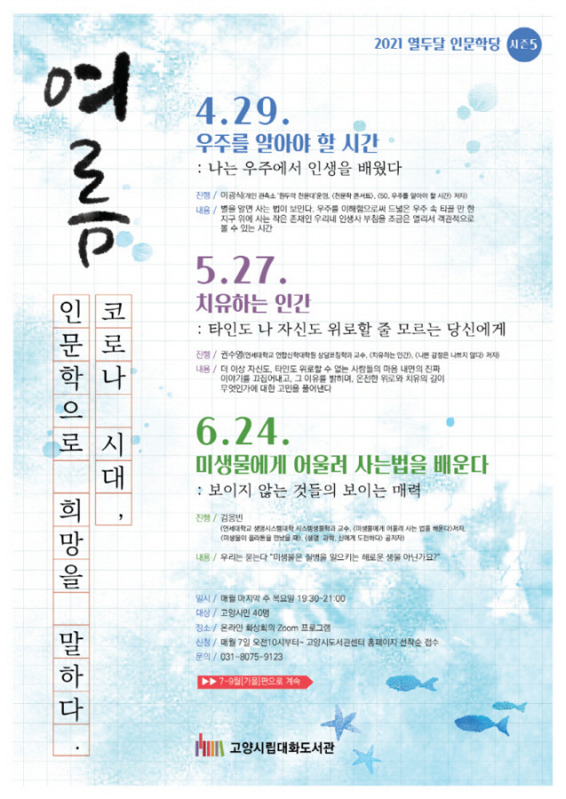대화도서관 관계자는 “코로나19로 지쳐있는 시민들이 2021년 펼쳐지는 열두달 인문학당. 시즌5 프로그램을 통해 더 나은 미래와 희망을 꿈꿀 수 있는 시간이 되길 바란다”고 밝혔다.