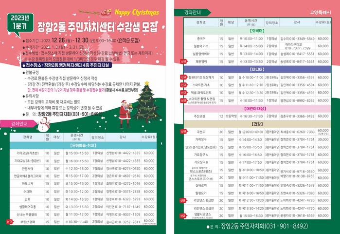 문화강좌 수강신청은 선착순 모집으로 장항2동 주민자치실(행정복지센터 4층)에서 방문 신청으로 받는다.