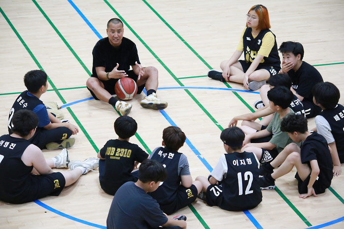 [사진설명] 이항범 대표가 유소년 선수들에게 농구 노화우를 전하고 있다.