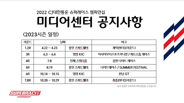 이로써, 2022 CJ대한통운 슈퍼레이스 챔피언십은 7개월여에 걸친 일정을 모두 마무리했다. 끝은 새로운 시작을 예고하듯, 슈퍼레이스는 최종전이 열린 23일 2023시즌 일정을 발표했다. 새 시즌은 4월 에버랜드 스피드웨이에서 개막한 후 10월 최종전까지 총 8라운드로 치러질 예정이다.