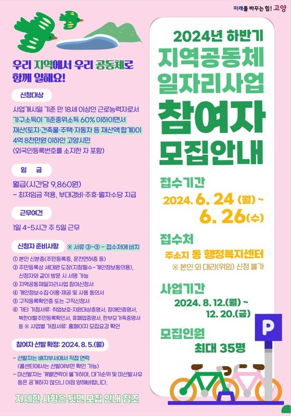 고양시, 2024년 하반기 지역공동체일자리사업 참여자 모집.
