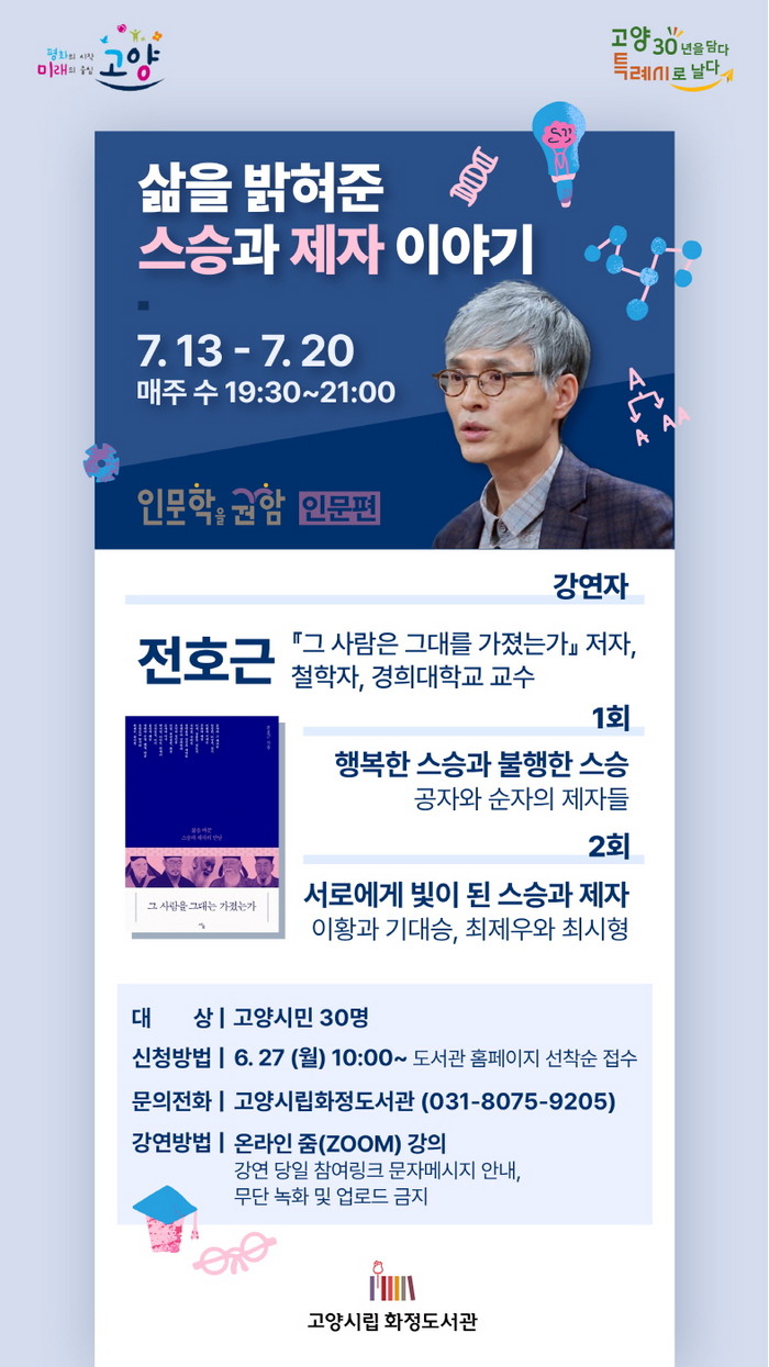 [부자동네타임즈 김인수기자] 고양시 화정도서관은 테마강좌 ‘인문학을 권함: 인문편’을 운영하고 있다. 7~8월에는 그 사람을 당신은 가졌는가의 저자 전호근 철학자, 몸에서 자연으로, 마음에서 우주로의 저자 고미숙 고전평론가를 초청할 예정이다.