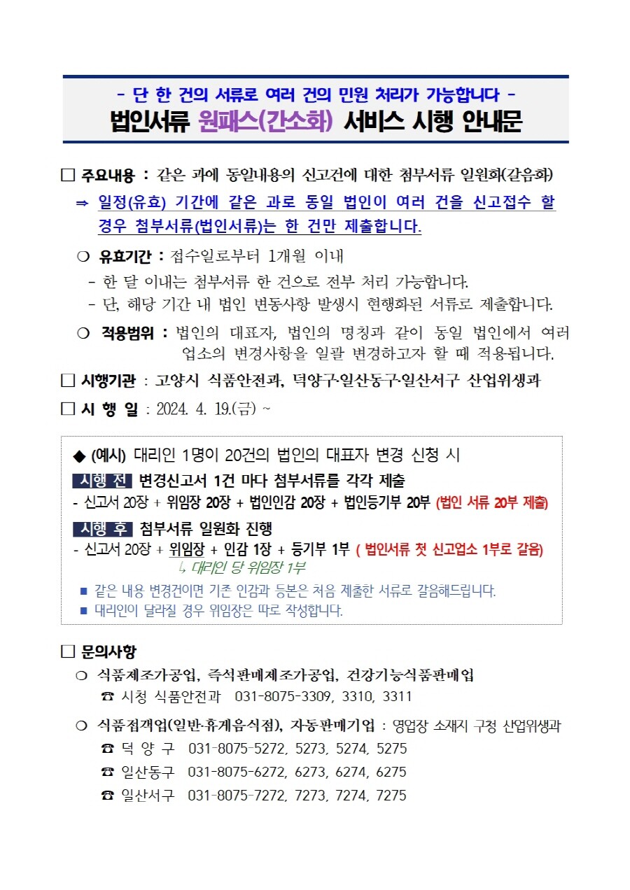 이는 고양시청 식품안전과와 각 구 산업위생과에서 선제적으로 실시하는 서비스이며, 즉석판매제조가공업, 건강기능식품판매업, 일반음식점 . 휴게음식점 등 위생업소 법인변경신청 시 적용할 수 있다.