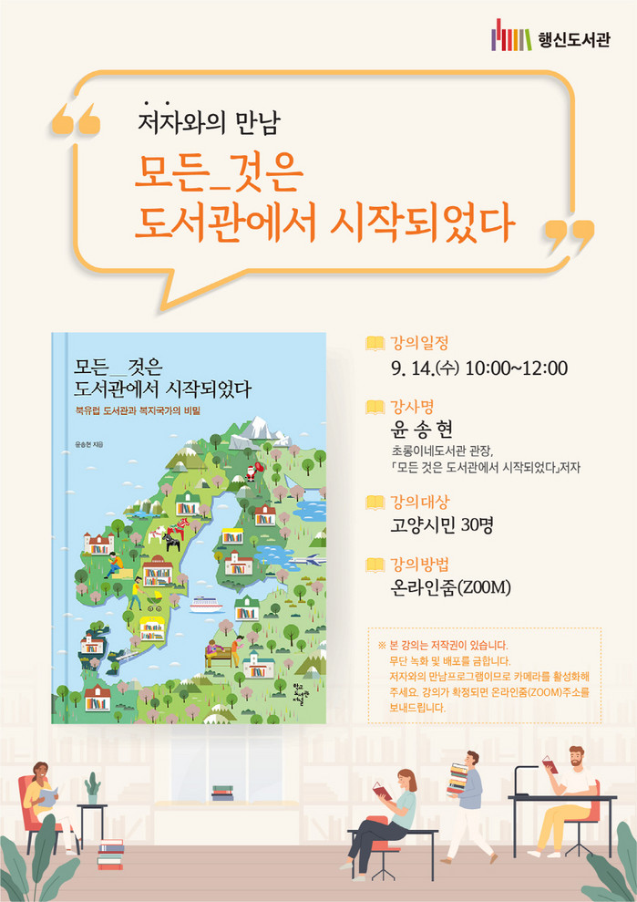 [부자동네타임즈 김인수기자] 고양특례시(시장 이동환) 행신도서관이 9월 14일(수) 저자와의 만남 프로그램 「모든 것은 도서관에서 시작 되었다」을 운영한다. 독서의 달을 맞이해 진행되는 이번 행사는 도서관 활동가이자 시민운동가인 윤송현 작가가 진행한다.